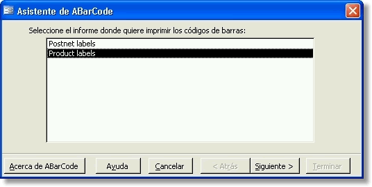 Guarde el informe, y abra el Asistente de ABarCode. Lo encontrará en la opción Complementos del menú Herramientas de Access. Si no es usuario registrado, verá la pantalla Registrar ABarCode: presione Cerrar para continuar. * En Access 2007, busque la opción Complementos dentro de la pestaña Herramientas (ver imagen). Seleccione el informe en la lista de informes, y presione Siguiente: