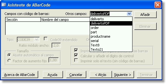 Seleccione el campo (o campos) que desea codificar en barras en el cuadro Otros campos, y presione el botón Añadir para que aparezca en la lista de Campos con código de barras: