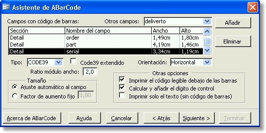 Finalmente, indique las características de cada uno de los códigos de barras, seleccionando el campo en la lista y ajustando sus propiedades: