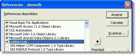 2. Seleccione Herramientas -> Referencias, desmarque ABarCode (o prjABarcode) de la lista de referencias, pulse Aceptar, y cierre la base de datos.