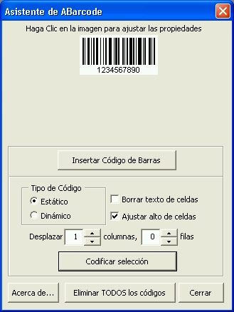 La opción Estático creará un código de barras con el valor actual de la celda. En cambio con la opción Dinámico, el valor del código cambiará si cambia el contenido de la celda. Tenga en cuenta que para poder ver los códigos de barras dinámicos se requiere que el control ABarcode ActiveX esté instalado en el computador, mientras que los estáticos podrá verlos e imprimirlos cualquiera.